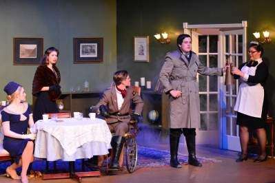 PRESS PHOTOS BY DANA GRUBBInspector Hound (Thomas Quackenbush) arrives at Muldoon Manor and hands his horn to Mrs. Drudge (Marley Mathias). Felicity Cunningham (Zoe O'Grady), Cynthia Muldoon (Chrissy Fay) and Magnus Muldoon (Dylan Gombos) welcome his arrival with a madman murderer on the loose. Copyright - DanaGrubb