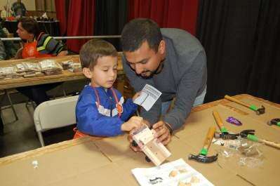 PRESS PHOTOS BY SUSAN BRYANTLiam Lopez receives help from his dad, Clive, both of Laurys Station, putting a window sticker on his load ‘n' go truck at the Kids Workshop Oct. 24 at the 13th annual Fall Eastern Pennsylvania Home Show at the Allentown Fairgrounds.