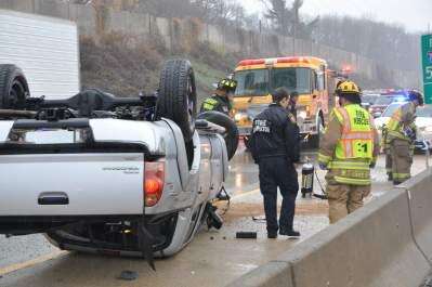 PRESS PHOTO BY JIM MARSHEastern and Western Salisbury firefighters and Salisbury Township Police were at the scene of a crash approximately 3:30 p.m. Nov. 19 as an unidentified male driver struck the concrete medial barrier and was ejected from his overturned pickup truck along Interstate 78 between the Lehigh Street and Cedar Crest Boulevard exits. Rescuers said the driver was seriously injured