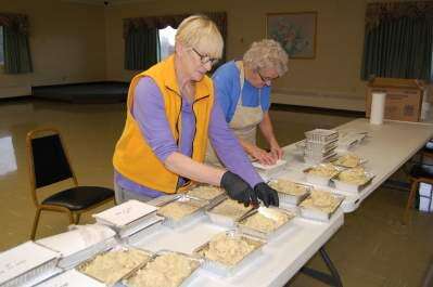 LEFT: Northern Valley Ambulance Corps Ladies Auxiliary members were busy Nov. 24 making nut rolls and potato filling for their Thanksgiving sale. Auxiliary members Caroline Kotch spreads out the potato filling as Marilyn Supp puts the lids on the containers of the potato filling for sale.PRESS PHOTO BY SUSAN BRYANT
