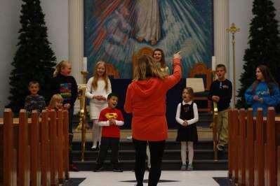 PRESS PHOTOS BY STEPHANIE RAPHUNJeanmarie Jordan, music director at Queenship of Mary Church in Northampton, leads members of the children's choir during a recent rehearsal for a children's Mass, to be held 4 p.m. on Christmas Eve. Children ages 3 to 12 are invited to participate in the choir and will sing during this special candlelight service.