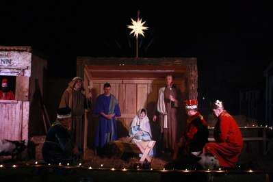 PRESS PHOTOS BY STEPHANIE RAPHUNMembers of St. John's United Church of Christ, Fullerton, celebrate the birth of Jesus with a live nativity Dec. 19 outside the Grape Street church. A narrator told the story of the birth of Jesus, while a choir sang accompanying music in a nearby gazebo that twinkled with Christmas lights. A handmade manger scene featured Mary, Joseph and Baby Jesus, who were