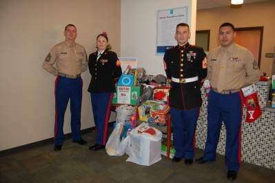 Marine Gunnery Sgt. Abrams, Sgt. Pedroza, Gunnery Sgt. Glatgelter and Staff Sgt. Cervantes take a few minutes for a group photo with the toys collected for children by members of the Sports and Human Performance Center at St. Luke's West End Medical Center, South Whitehall.PRESS PHOTOS BY SUSAN BRYANT