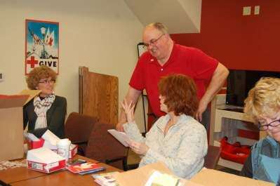 PRESS PHOTOS BY SUSAN BRYANTAmerican Red Cross Greater Lehigh Valley Chapter employees Susan Kalkhurs-Beam and Deborah Pollock speak with Peter Brown, executive director of the American Red Cross Greater Lehigh Valley Chapter, about a Christmas card. On left, Patti Farrell, disaster mental health volunteer with the American Red Cross, sorts cards at the Holiday Mail for Heroes card-sorting party.