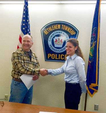 Former Bethlehem Township Commissioner Marty Zaworski welcomes Gretchen Kraemer to the department.