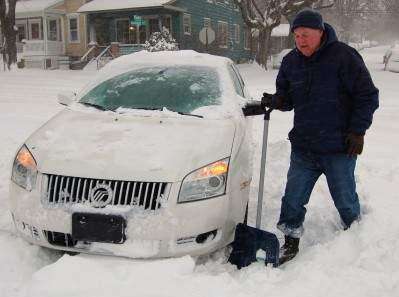 PRESS PHOTOS BY TIM GILMANGlenn Zechman gets stuck in snow at Maple Street and Washington Avenue. The Bethlehem resident said he had called AAA to be towed out of the deep snow, but was told they were “overloaded with emergency calls.” Neighborhood residents and passing motorists helped get Zechman's car back onto Washington Avenue, which was being plowed regularly by city crews. More coverage on