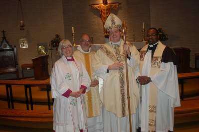 St. Stephen's Episcopal Church, Whitehall, held the Celebration of New Ministry recently for the Rev. H. Jonathan Mayo at the Mechanicsville Road church. The Bishop Sean Rowe presided. Pictured from left are the Rev. Canon Anne E. Kitch, Mayo, Rowe and the Rev. Steve Foster.PRESS PHOTO BY AL RECKER