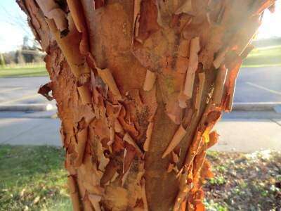 The cinnamon-brown, exfoliating bark is the star of this tree’s show. Young stems are deep, luxuriant brown to reddish brown and usually begin to exfoliate in their second year. Mature stems exfoliate in thin sheets, revealing rich reddish-brown tones beneath. Old trunks lose some of their exfoliating character, but retain the striking color.