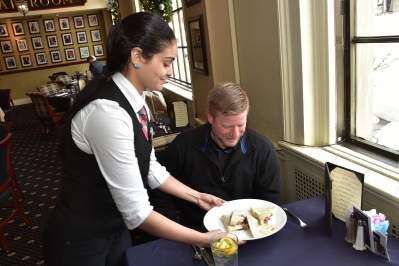 PRESS PHOTOS BY DANA GRUBBHotel Bethlehem server Ariana Olmeda delivers an order of short rib quesadillas to Downtown Bethlehem Manager Tim Brooks, who enjoyed a restaurant week menu item in the Hotel's Tap Room. Brooks, who is responsible for promotion of restaurant week, said he was going to try to hit each participating restaurant for lunch or dinner during the event.
