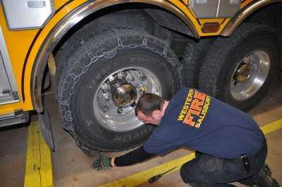 PRESS PHOTO BY JIM MARSHWestern Salisbury Fire Department assistant chief engineer Darrell Singles attaches snow chains to fire department trucks and engines Jan. 23 at the Swain fire station so firefighters are able to respond to any emergencies that may arise during the weekend blizzard.