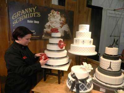 Granny Schmidt’s Bake Shop in Whitehall might have a nostalgic name, but its displays for the expo exemplified the romantic and modern looks in wedding cakes. Themed cakes are popular today, such as the bake shop’s black-and-white creation based on “A Nightmare Before Christmas,” baked for a Halloween wedding.