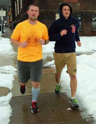 PRESS PHOTO BY TIM GILMANLehigh University graduate students Michael Gritzmacher and Joshua Core jog through South Bethlehem as melting snow from the recent storm makes their favorite recreational activity easier. With temperatures in the mid-50s, the running partners are training for a half marathon race in Brooklyn during March. Gritzmacher also said they're looking forward to joining his cousin