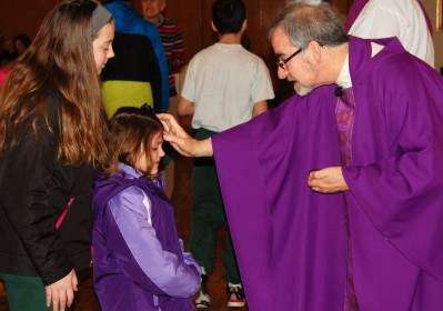 Press Photos by Tim GilmanEmma Marzen of St. Anne School receives the sign of the cross on her forehead by Father Anthony Mongiello during the Ash Wednesday service at St. Anne's Church in Bethlehem.The kindergarten student was accompanied by sixth-grader Vanessa Speciale, left, “prayer partners” who received the sacred Ash Wednesday blessing together. The Feb. 10 service, which was also open to