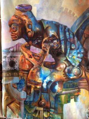 Peralta’s vivid use of acrylic paints poses another transcultural story in the stonewash sculpture figures found at the corners of the canvas. The sculpture-like figures are reminiscent of the ancient Taino Cemi God from the Caribbean.
