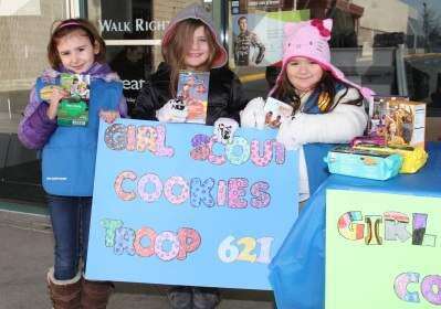Mia Kenney, Hailie Garger and Taylor Johnston are all bundled up Feb. 6 as they sell Girl Scout cookies outside Great Clips in Whitehall Township. The girls are members of Daisy Troop 621, which meets at St. Stephen's Episcopal Church, Whitehall.press photos by linda rothrock