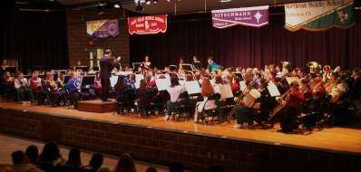 Press Photos by Tim GilmanConductor Daniel E. Zettlemoyer leads the All-City Middle School Band. Conductors from the four district middle schools each directed a portion of the annual concert. Zettlemoyer teaches at Nitchmann MS. Band banners from each school were suspended from the stage ceiling for the special winter concert.