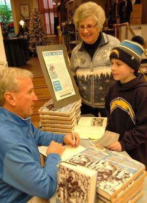PRESS PHOTO BY TIM GILMANAuthor Dave Seidel of Allentown signs his latest sports book, “The Uncrowned Champs,” for MaryAnn Belchunes, and her grandson Reagan Kaar, both of Bethlehem, the Saturday before the Super Bowl. Seidel said his second book about professional football is about “how the 1963 San Diego Chargers would have won the Super Bowl.” Seidel, who has a brother living in Bethlehem,