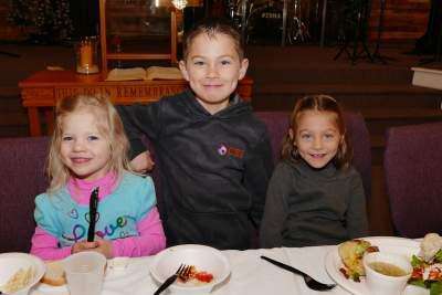 PRESS PHOTO BY LOU WHEELANDHope Community Church, Claussville, had its annual soup, salad and spuds dinner Feb. 27. On the menu were baked potatoes, homemade soups, salad fixings and dessert. The church youth group served the hungry attendees. Ella Zellner shares time with buddies Colin and Reese Macaulay.