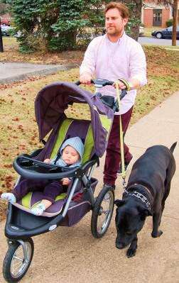 Press Photo by Tim GilmanChris Morris walks along East Market Street in Bethlehem with his son Ridge and their Lab mix, Horacio. The Bethlehem resident said the trio walks “just about every day,” He added that an early spring is a nice change and that his young son will be experiencing his first spring. Last week's warm spell resulted in a record-setting Thursday of 80 degrees, breaking the