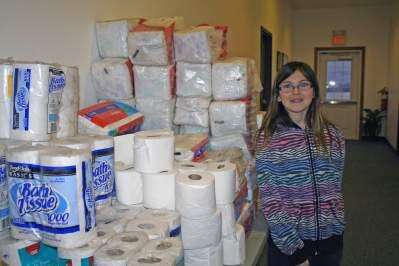 PRESS PHOTO BY DEBRA PALMIERIKorrin Kelly of Kutztown was on hand at the Living Stone Fellowship corned beef and cabbage dinner March 12 to give out free paper products. Church member Jason Wisser donated the paper goods provided free by Widows Palates of the Scranton area.