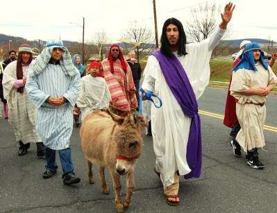 Press Photos by Tim GilmanJose Medina of Bethlehem portrays Jesus during the re-enactment of His triumphant entry into Jerusalem on Palm Sunday. Jesus's disciples and followers are part of the procession Sunday morning along East Broad Street from Stefko Boulevard to the EL Shaddai Ministries building about four blocks away. The eighth annual event involves a cast of about 30 costumed performers.