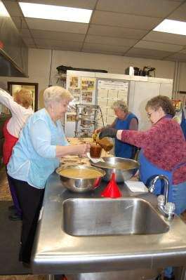 PRESS PHOTO BY SUSAN BRYANTNOVA Ladies Auxiliary members Ethel Harakal holds a measuring cup as Julia Barna pours molasses filling into it for shoofly pies March 7. Marie Dean works at the oven as Lucille Blose pours the filling mixture into pie shells for the annual shoofly pie sale.
