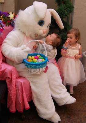 Press Photo by Tm GilmanNora Borck seems mesmerized by her first Easter Bunny at the Moravian Book Shop recently. Her older sister, Molly, was especially dressed for the Easter event, but not as enthusiastic.Their mother, Angela Borck, a Bethlehem native and Freedom HS graduate who lives in Brooklyn, N.Y., said they were visiting her family during Easter. They were at the Moravian Book Shop for