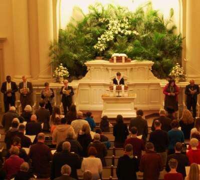 Press Photos by Tim GilmanMore than 260 early morning worshipers attend the Easter Sunrise Service which starts at Central Moravian Church in downtown Bethlehem and concludes at the nearby God's Acre Cemetery. The Bethlehem Area Moravian Trombone Choir provides the music for the dawn service which dates back more than 130 years. The choir holds the distinction of being the oldest all-trombone