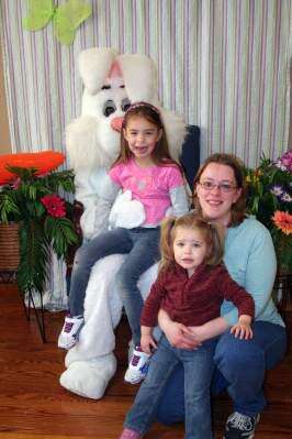 Kylie and Mackenzie Friz, along with their mom, Jamie Hunsicker, visit with the Easter Bunny during the March 26 egg hunt at Heidelberg Union Church, Heidelberg Township. Photos with the bunny benefited the Heidelberg Heights Playground Association.PRESS PHOTO BY DEBRA PALMIERI