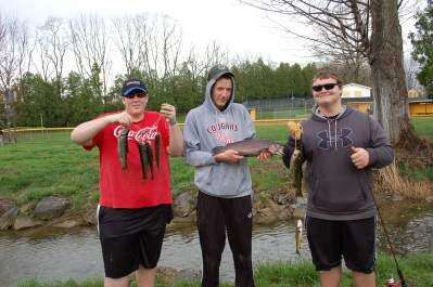 PRESS PHOTOS BY AL RECKERJakob Fogel, Joshua Gogel and Zack Kanishock, all of Catasauqua, show some of the trout they caught Saturday in the Coplay Creek by the Hokendauqua Park & Playground, Whitehall. Opening day of trout season was a success, they say, thanks to PowerBait.