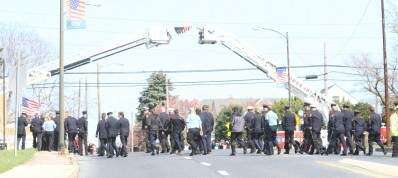 Members of the Whitehall Fire Department cross Grape Street en route to St. John's UCC, Fullerton, for the start of the viewing for Whitehall Fire Chief Robert Benner. PRESS PHOTOS BY LINDA ROTHROCK Copyright - Scott M. Nagy