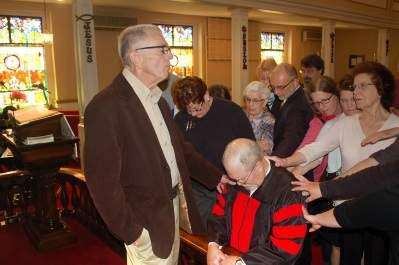 Roth knelt for the commissioning of the new pastor as the Rev. Randy Ott, presiding; David Focht, a church elder; and Roth’s family placed their hands on Roth.