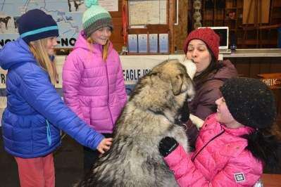 PRESS PHOTOS BY DANA GRUBBIditaskate supporters Jenna Feldman, Katie Feldman, Lisa Kirby and Mikayla Kirby receive a warm welcome from Jackie, an Alaskan Malamute owned by event organizers Jan and Walt Tremer. All four event visitors are from Bethlehem. Copyright - DanaGrubb