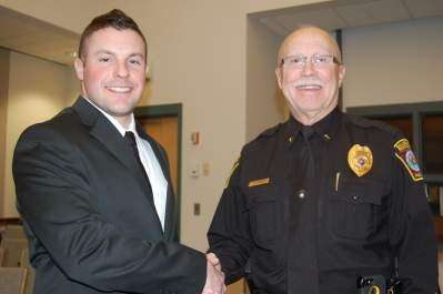PRESS PHOTO BY PAUL WILLISTEINSalisbury Township Police Chief Allen W. Stiles, right, greets the newest member of the township police department, Jason Harrison, left, whose first day with the department was April 11. “It was a busy day. There were three felony warrants,” Stiles said, introducing Harrison to commissioners at the April 14 meeting. Harrison, 24, a Lansford, Carbon County, resident,