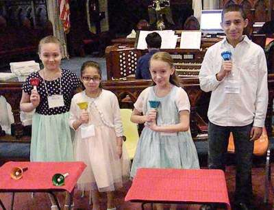CONTRIBUTED PHOTOSBell ringers Alyssa Luciano, Jadelynn Luciano, Nayeli Ortiz-Figueroa and Waldemar Galarza Jr., left, join singers Jonathan Landon, Carrie Weston-Landon, (back row) Dan Rambo, John Mink and Geoff Brace, right, in an anthem at Zion's Liberty Bell United Church of Christ, Allentown.
