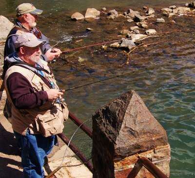 Press Photo by Tim GilmanAvid anglers Lou Hirsch and Gilbert Applegate try their luck in Bethlehem's Monocacy Park. The two city natives, who have fished and hunted together for many years seemed to enjoy the relative quietness of the park after the customary mob scene on April 12 for the official first day of the trout season in Pennsylvania. Hirsch said they had hooked some native trout, but