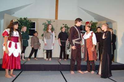 PRESS PHOTO BY SUSAN BRYANTPlayers of the Stage thespians Avery Masenheimer, Karis Nussbaum, Bryleigh Barnhart, Leeyah Martinez, Molly Williams, Noah Mills, Eli Masenheimer, Hannah McDonnell, Nathaniah Neumann, Leah Zolotareva, Lydia Peters, Abigail Frailey and Gerard Behe rehearse a scene from “The Wind in the Willows” to be performed April 28-30 at Living Hope Presbyterian Church, Lower Macungie