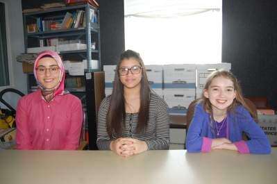 PRESS PHOTO BY PAUL WILLISTEINLehigh Valley students whose poems were selected in the Press 11th annual Student Poetry Project read their work on the April 18 broadcast of “Lehigh Valley Arts Salon” on WDIY, 88.1 FM, wdiy.org. From left: Mualla “Mia” Ulas, 17, Grade 11, Whitehall High School, Whitehall-Coplay School District; Jazlynn Cruz, 14, Grade 8, Trexler Middle School, Allentown School