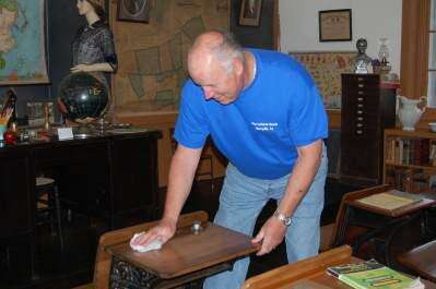 Wayne Mery was reaching high as he helped dust the Lehigh Township Historical Society’s displays and shelving as members and volunteers prepared for a May 8 opening. Mery said it was the second time in the year members of Hope Lutheran Church helped.