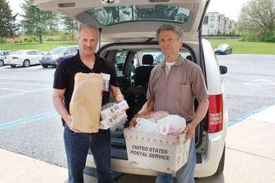 PRESS PHOTO BY AL RECKERWhitehall Food Pantry volunteers Ernie Kline and Bill Antrim are busy unloading an incoming SUV packed with donated food for the mail carriers' annual Stamp Out Hunger campaign Saturday. The pantry is housed at St. Stephen's Episcopal Church, Mechanicsville Road in Whitehall.
