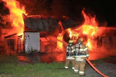 Firefighters work to control a fire Sunday morning at the former General Supply, 1 Bridge St., Coplay. The borough now owns the vacant property. According to reports, a Chestnut Street resident saw the flames at about 4:10 a.m. and called 911. Crews from the borough, Whitehall Township and South Whitehall Township responded to the scene.PRESS PHOTO BY DENNIS WETHERHOLD JR. Copyright - Scott M. Nagy