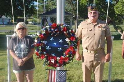 PRESS PHOTO BY AL RECKERDolores Reed, a Gold Star mother, and Dennis Makovsky, commander of Veterans of Foreign Wars Post 7293, Egypt, place a wreath at the base of the new flag pole June 14 during a ceremony marking the initial phase of the veterans memorial plaza, underway on the grounds of the township municipal building. The flag pole was a donation of the Gilbert family and Gilbert Funeral