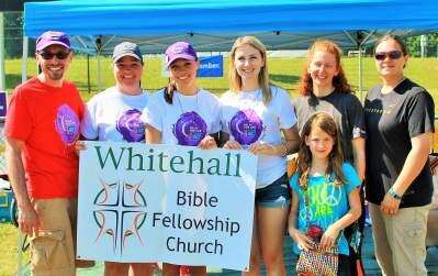 PRESS PHOTOS BY TINAMARIE MARTINWhitehall residents Mike, Judy and Grace Helfrich, Lauren Williams, Rachel and Caroline Schmoyer and cancer survivor Janelle Rennolds participate in American Cancer Society's Relay for Life, held Friday and Saturday at Whitehall High School's stadium. Their team, representing Bible Fellowship Church, walked in support of Rennolds, a survivor of Hodgkin's lymphoma.