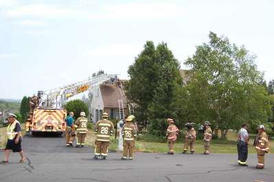 PRESS PHOTO BY SUSAN BRYANTSmoke can be seen coming out the window above the garage as volunteer firefighters from Greenawalds, Woodlawn, Neffs, Tri-Clover, Fogelsville, Schnecksville, and Whitehall fire departments work to extinguish a two-alarm fire around 11:30 a.m. June 27 at 3747 Lindy Drive, North Whitehall Township.