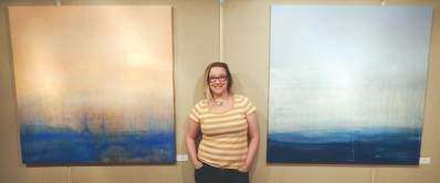 Her abstract expressionist work on display at Baum is of colors that project joy. Her triptych, “Claude and Joan Sittin’ in a Tree,” is influenced by her two favorite painters, Claude Monet and Joan Mitchell, with Monet’s famous yellow water lilies and the look of Mitchell’s multi-paneled abstract landscapes incorporated into the acrylic on canvas.