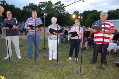 PRESS PHOTO BY SUSAN BRYANTStephen Oplinger, David Moll, Carol Gehris, Linda Sherer and CWTAP television personality Uncle Jeffrey Tapler led the old-fashioned patriotic sing-along July 2 at the 13th annual Schmoyer family Independence Day fireworks celebration at Breinigsville Park.
