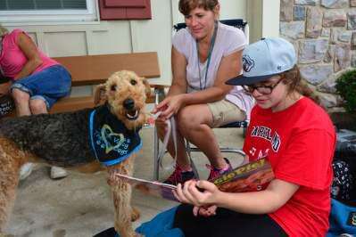 PRESS PHOTOS BY LOU WHEELANDSeveral Therapy Dogs from the Lehigh Valley were on hand at Parkland Community Library June 27 to listen as youngsters read them stories. Keely Schofield of Upper Macungie reads to Miley, 6, an Airedale Terrier who keeps Katherine Appleton of Upper Macungie as her human companion.