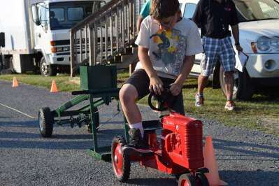 All in a day's work says ten-year-old Malachi Smith of New Tripoli as he dismounts his tractor after reaching the cone and achieving the first “full pull” of the evening. Smith made a difficult pull look easy as he took first place in the class 4 division of the Children's Pedal Tractor Pull competition, partially sponsored by Eckroth Equipment.