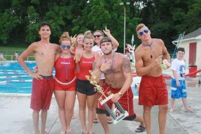 PRESS PHOTOS BY STEPHANIE RAPHUNLifeguards from Jefferson Pool celebrate their win Saturday during Wacky Water Games, held at Hokendauqua's Parkview Pool. Coach Jami Henry (not pictured) and her team - Liam Wehr, Cassidy Larkin, Vita Marks, Ian Schleicher and Jackson Buskirk - defeated lifeguards from Cementon and Parkview to take home the Battle of the Guards trophy. Also pictured are Bri Peacock