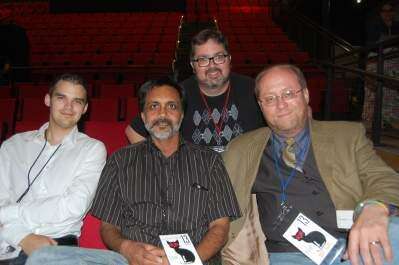 PRESS PHOTO BY PAUL WILLISTEINAnjul Nigam, front, center, co-producer, co-screenwriter, actor, “Growing Up Smith,” opening-night film, SouthSide Film Festival (SSFF), with Glenn Koehler, left, director, SSFF; Jeff Vaclavik, right, president, SSFF, and Benjamin Bertalan, back, center, SSFF film wrangler.